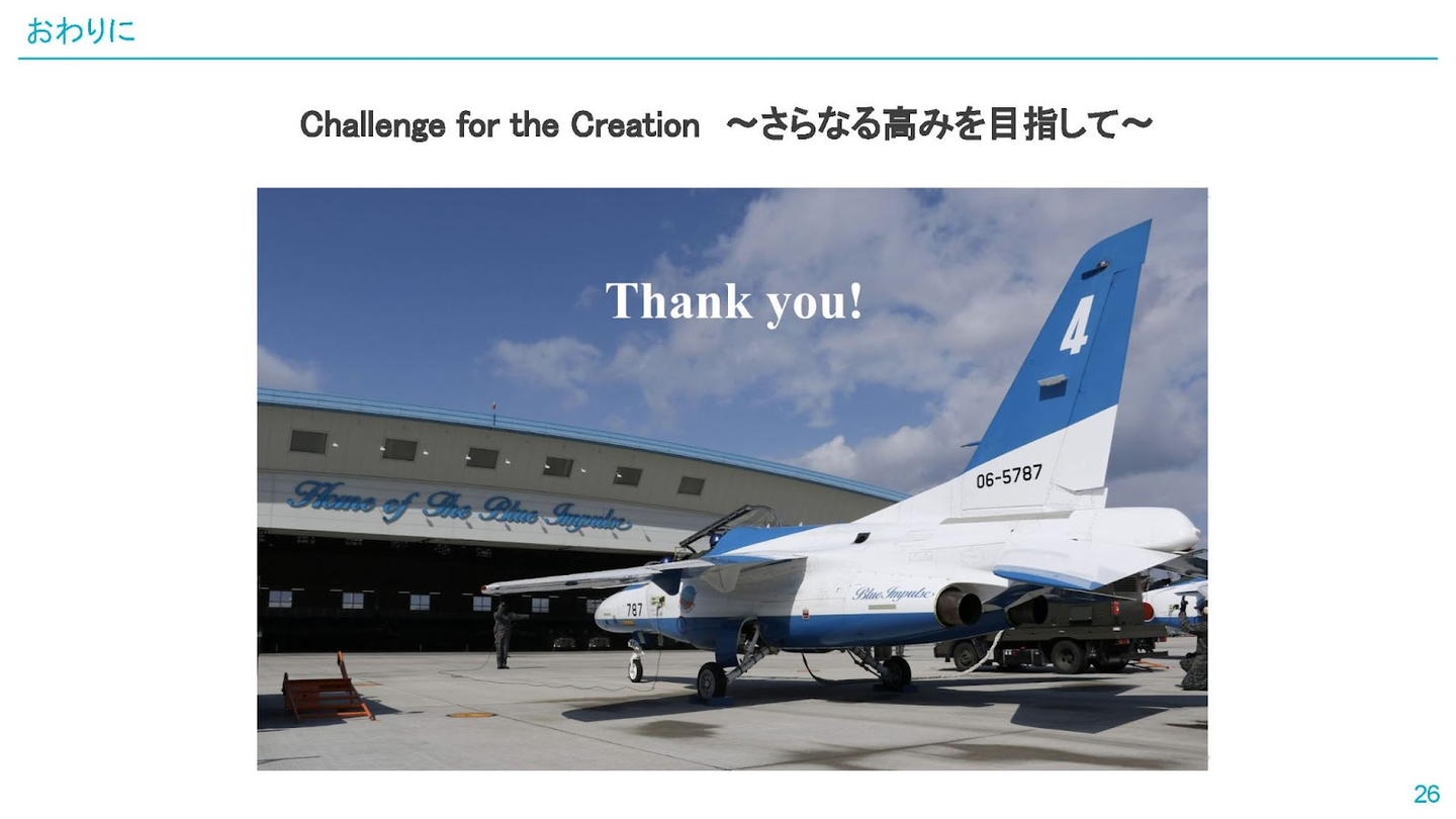 私の好きなブルーインパルスは「Challenge for the Creation 〜さらなる高みを目指して〜」というスローガンを掲げています。ブルーインパルスのメンバーは、全国から選抜された優秀な方々の集まりです。そんな彼らでさえ、より良い演技を観客に届けるために、毎日愚直に訓練に励んでいます。