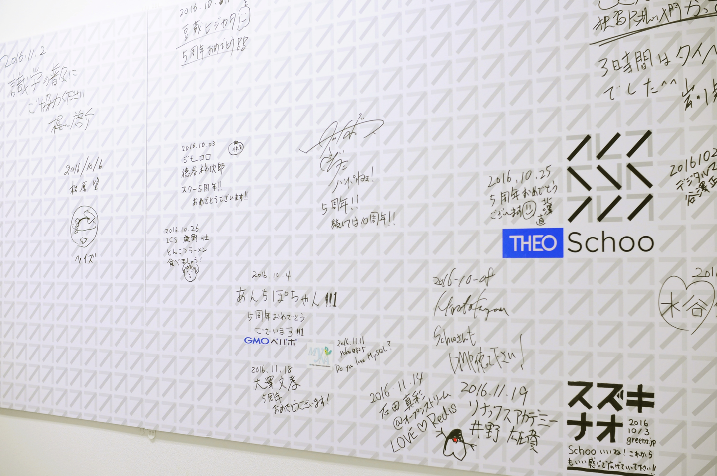 ◼︎スクーのスタジオにはボードがあり、登壇した先生たちがサインを残して行くことが慣例となっている