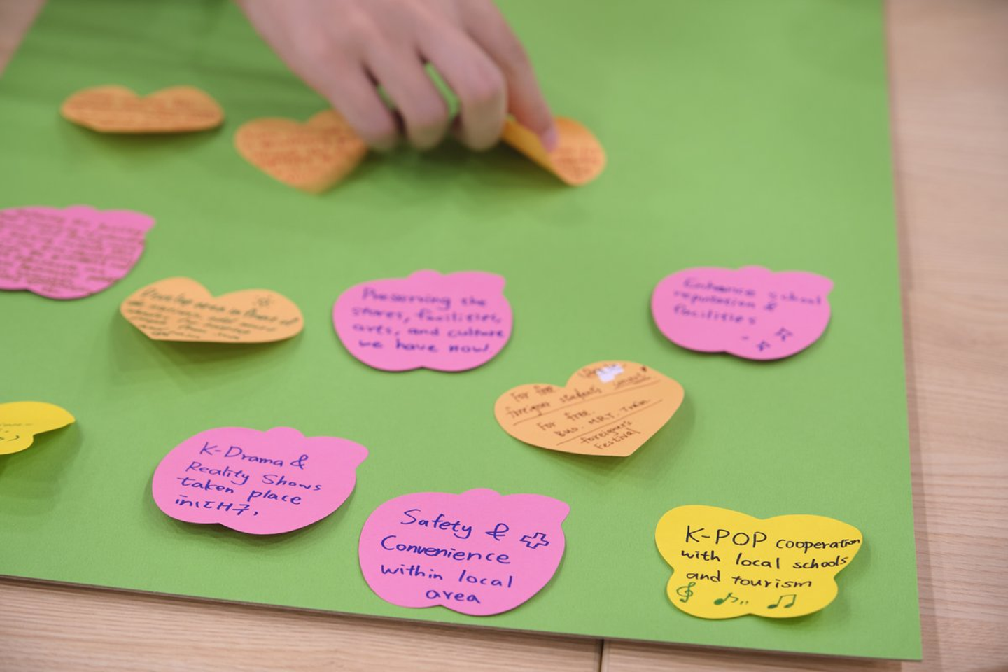 背景を補足すると、韓国第3の都市とも言われる大邱は、大学を始めとした教育機関が集まる学生都市の側面も持っています。この質問は、学生たちのキャンプで得られた気づきや思考をまとめるのに適切な問いであるだけでなく、大邱市が自らの指針と課題をストレートに学生に提示し、そこから提案される意見を少しでも自治体運営の参考にしようとする意図がみてとれるのではないかと。学生であっても、一個人として尊重し社会的責任の一端を担わせるという姿勢のようにも感じました(閉会式はもちろん、市役所職員の方々も見学しておられました)。