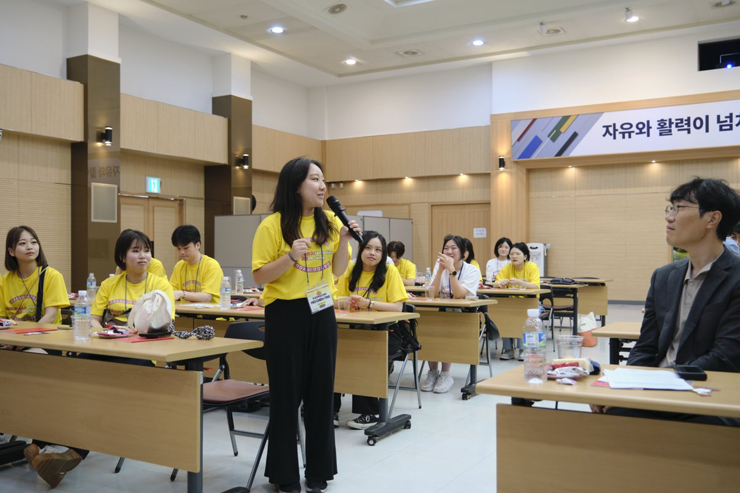 7月1日月曜、朝9時半。さあ始まりました、ユースキャンプ。まずはオープニングセレモニーから。主催である大邱市からの開催スピーチの後、くじ引きで当たった選ばれし幾人かの学生は、スピーチ形式で自己紹介。