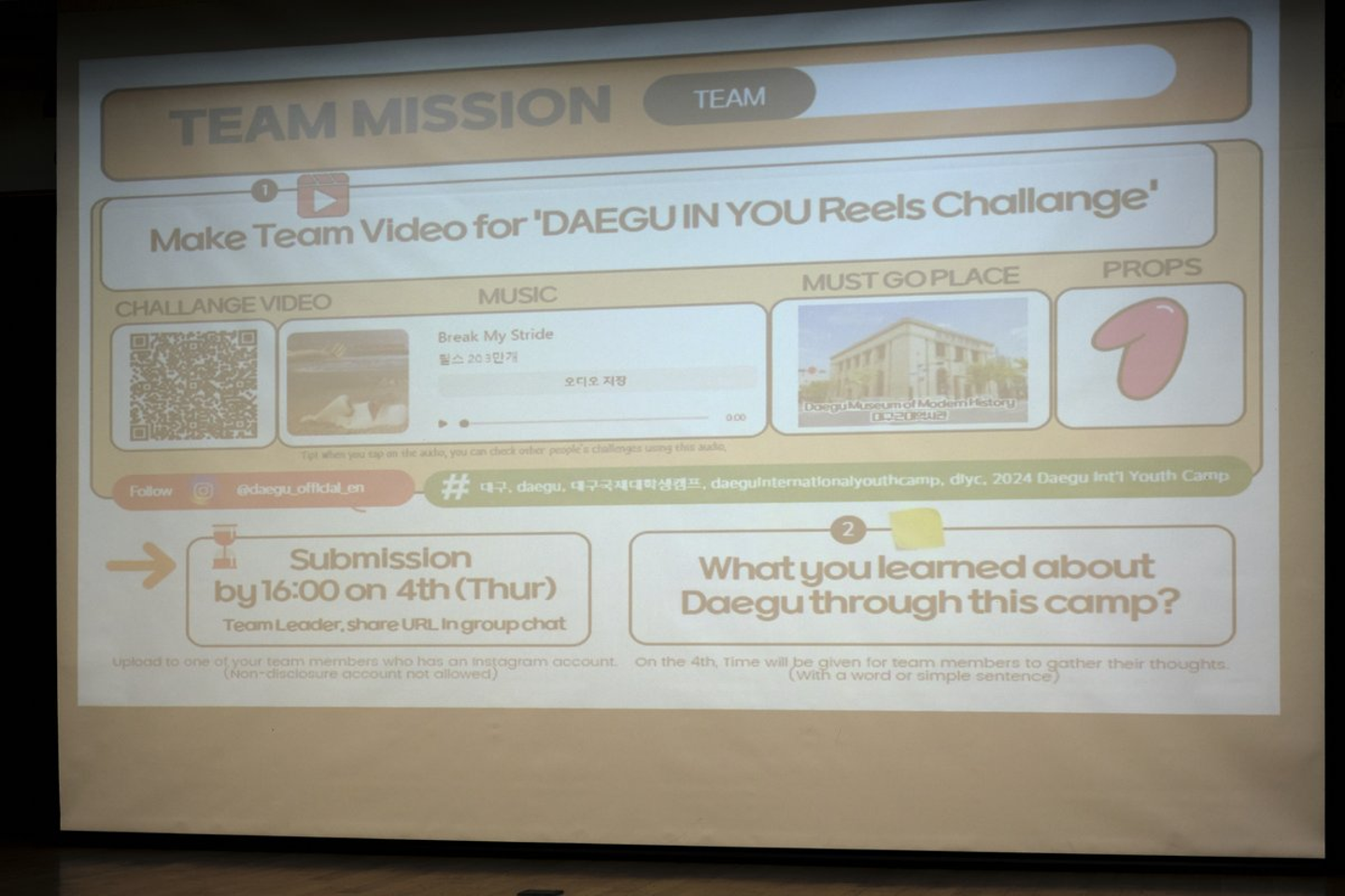 チームごとに指定の場所で、指定の音楽で、指定の形での動画をとって発表するというもの。学生たちは協力することで仲も深まるし、大邱を知ることにも繋がるし、大邱のプロモーション動画にもなるし・・これは一石二鳥の企画! 日本でも参考にできそうです✍️