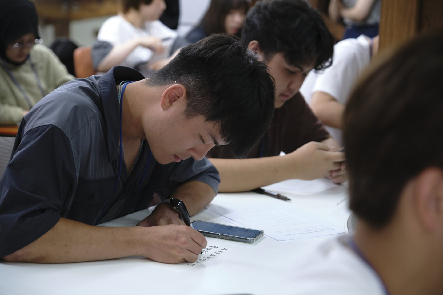 議題に対して、めいめいに考えを書き、意見や質問を交わす学生たち。