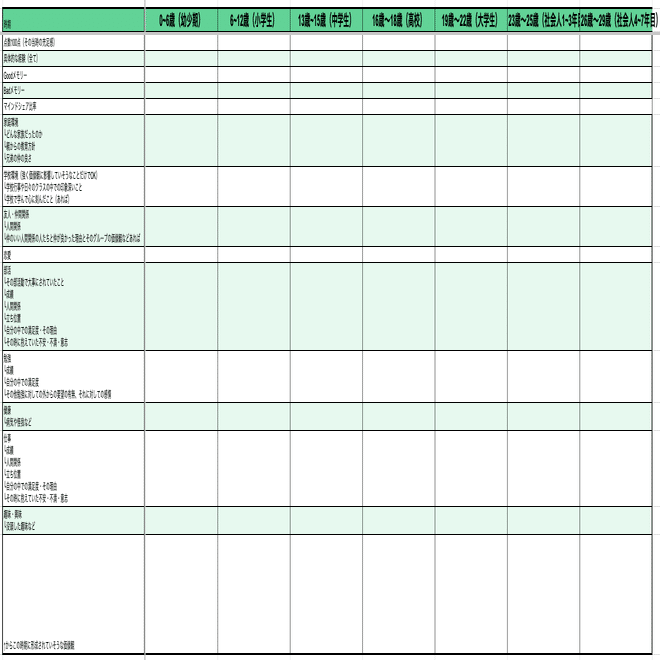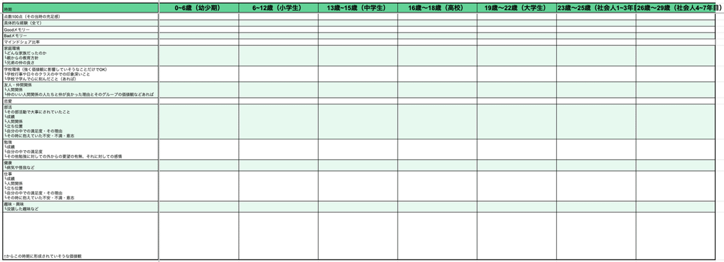 幼少期から現在まで、自分の人生を時系列で振り返って書き出していきます。加えて、「自分はどんな人間か」「何に幸せを感じるか」「何にストレスを感じるか」といった問いに、ひたすら向き合う。