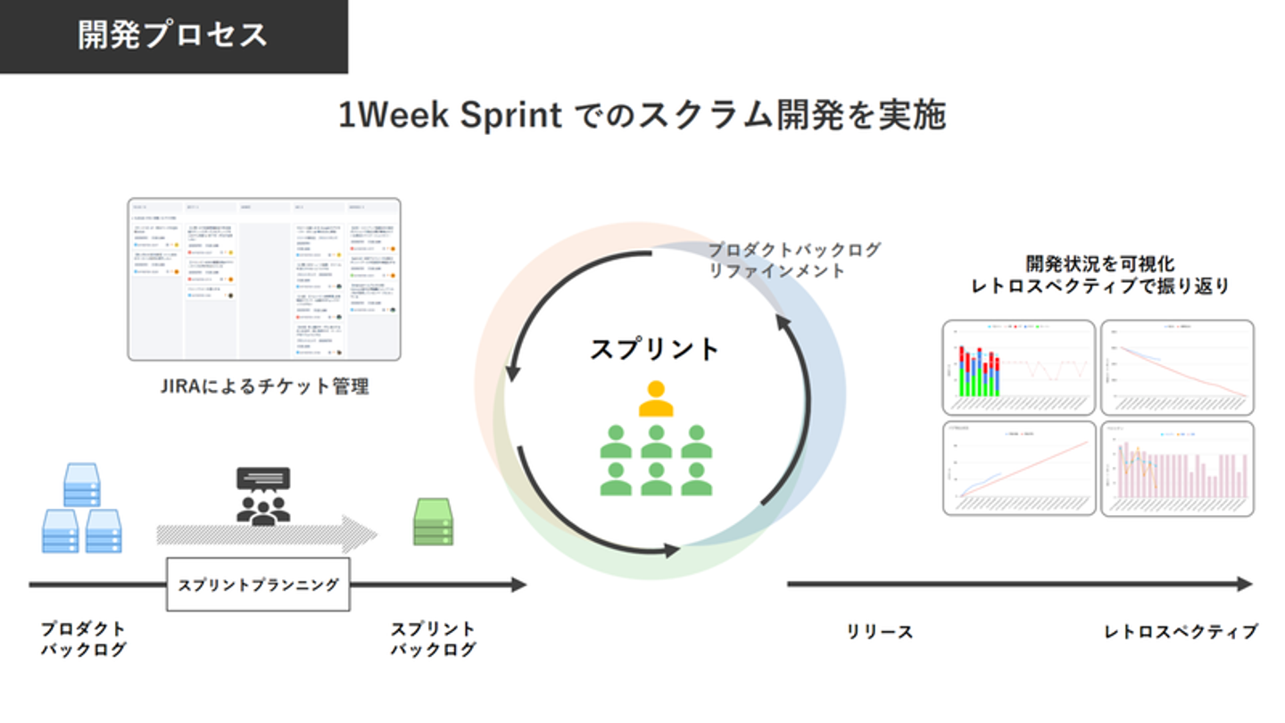 開発する内容に関してはスプリントによって様々ですが、事業戦略にもとづいた「トップラインを伸ばすための開発」、「VOC(Voice Of Customer)を中心としたチャーンを防止するための開発」、「プロダクトの世界観を創っていくための開発」をプロジェクトとして立ち上げています。プロジェクトリーダーを中心に、数スプリントに跨ぎながら一週間でどこまで進めるかをプランニングする形をベースとしています。