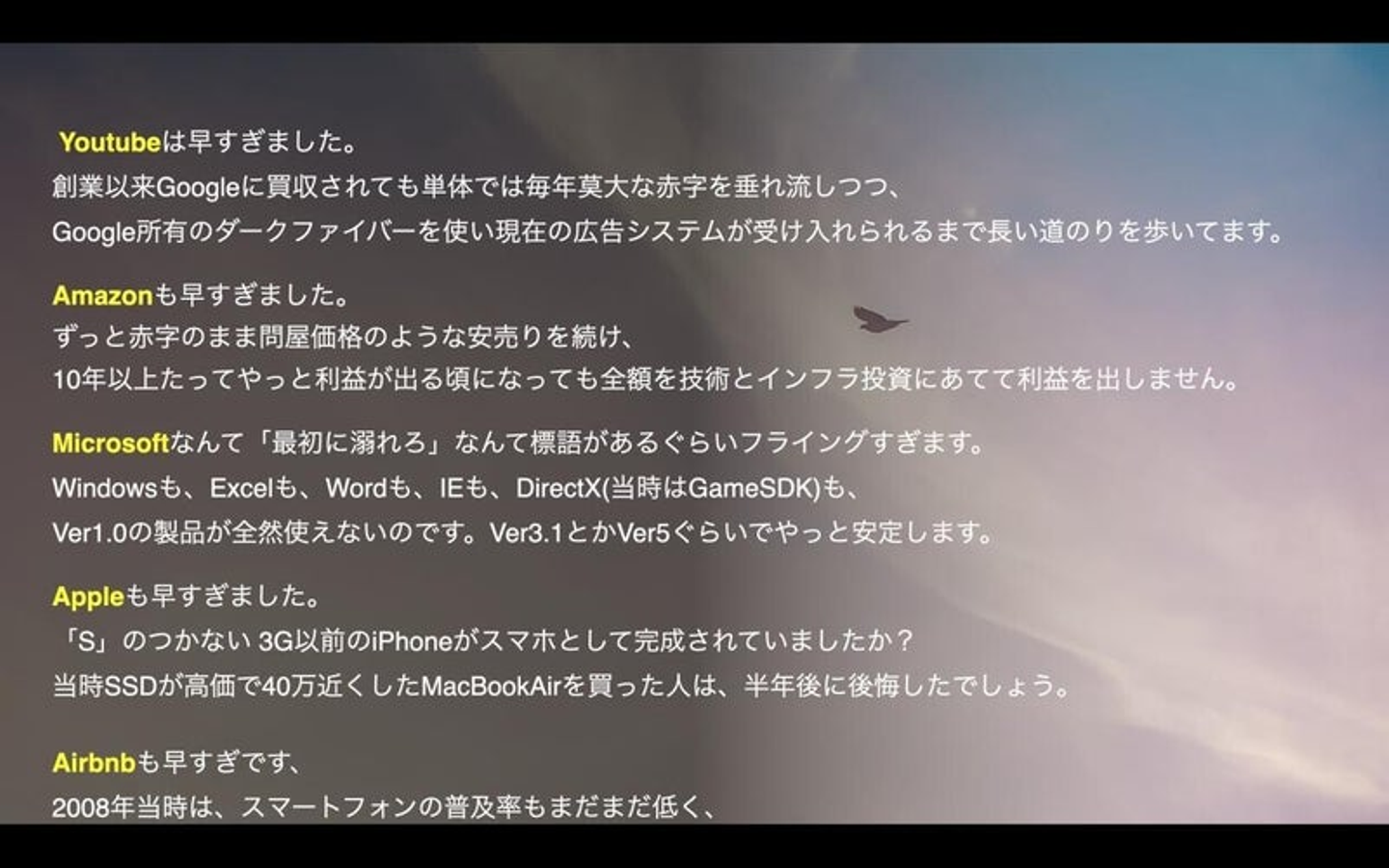 Airbnbも今でこそめちゃくちゃ巨大なモンスター企業になっていますけども、投資家に60回ぐらい断られてですね、当時一切概念がなかったタイミングから「シェアリングエコノミー」を作り出しています。なので、今世の中のインフラになっている企業は、大概今の国に対してマーケットフィットをして解決しているのではなく、将来発生するであろうマーケットに対してプロダクトフィットさせに行っている。