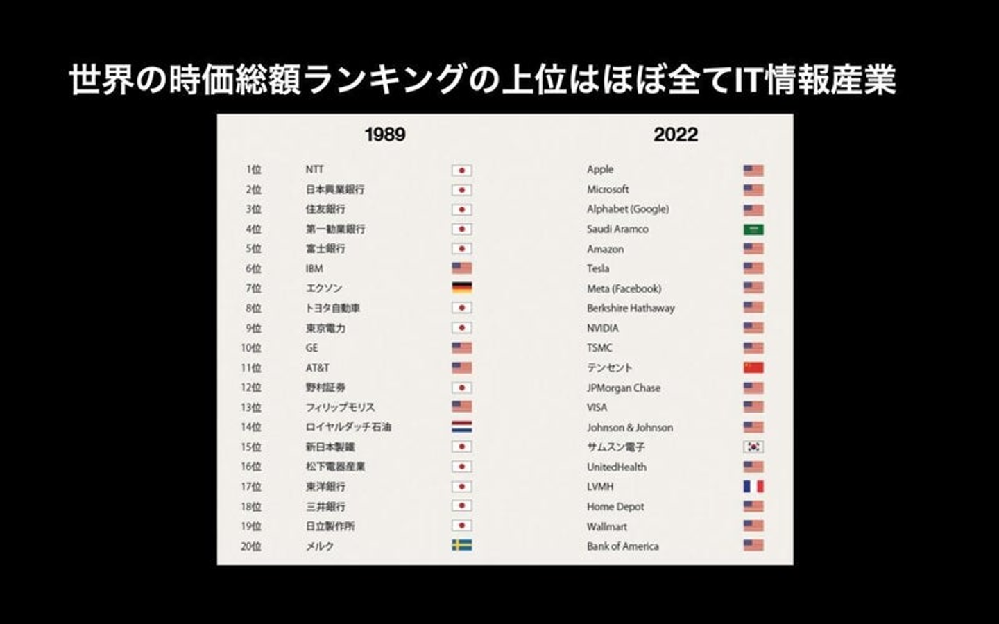 世界の時価総額ランキングも、1989年には日本がトップランカーだったにも関わらず、今は1社も入っていない状況です。日本では長らく製造業がメインだったので、基本的にプロダクトは優れている中で、大量に新卒一括採用をして、終身雇用で働いてもらえばトップラインがどんどん伸びていくでしょうという考え方で事業運営をしてきたかと思っています。