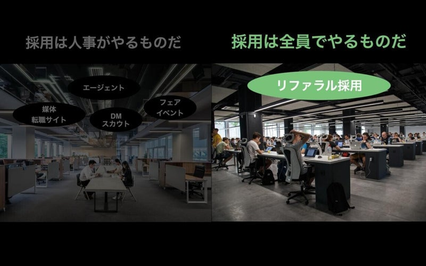 デジタル改革や国の産業構造改革に関しても、待っているだけでは抜本的に変えられないなと思っています。我々がそこに対してどうやって価値提供していけるかというと、やっぱり「採用」のところかなと。これまでは「リファラル採用」という概念を提唱してきました。リクルーティングの中で”みんなでやる採用”と言えば、おそらく大概の企業はリファラル採用という言葉が出てくるんじゃないかなと思います。まだまだ地方においては浸透していない企業もあると思いますけれども。