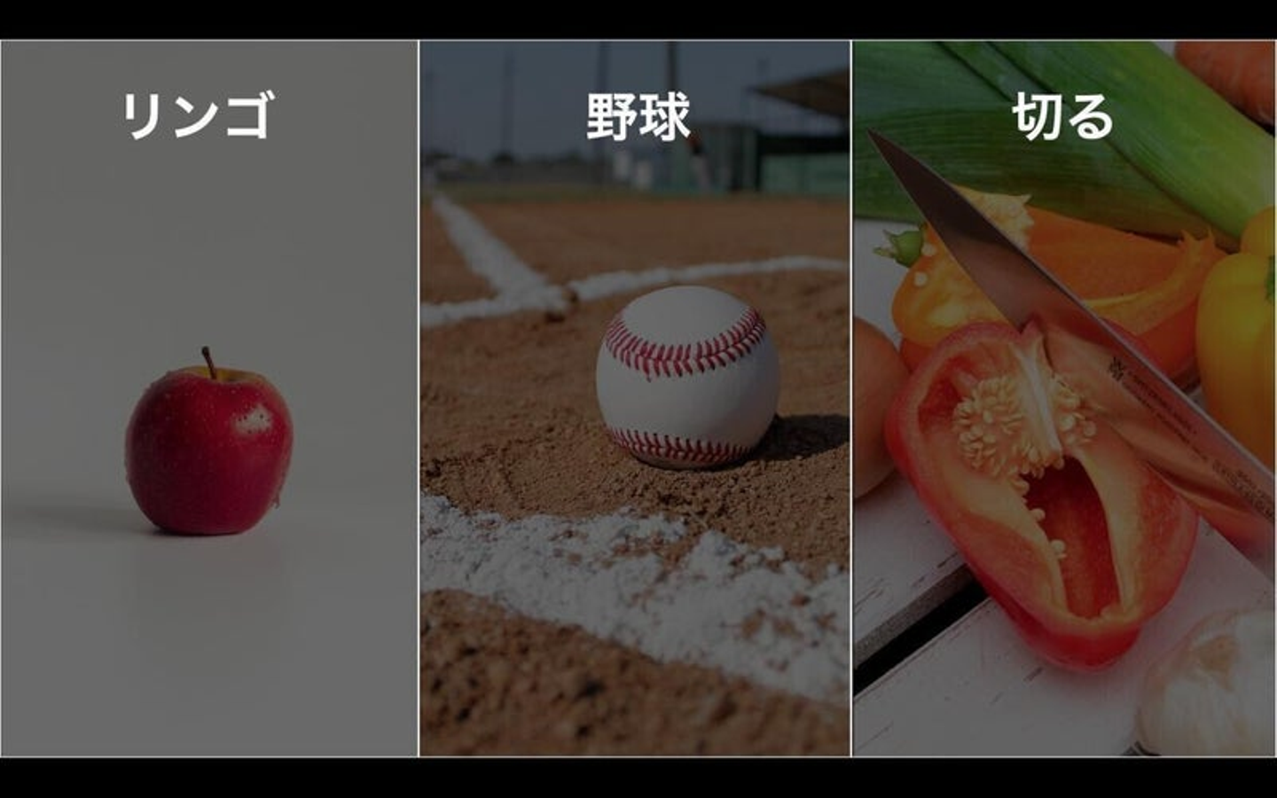 まず、概念ですね。ちょっと分かりやすく出してみます。生まれてまだ間もない何の言葉も知らない子供にこれらの画像を説明するとしたら、皆さん何と伝えますか?一番左は赤くて丸い甘いものです。真ん中は9対9でミットとグローブを持って勝負するもの。右側はさくっとする動詞ですね。