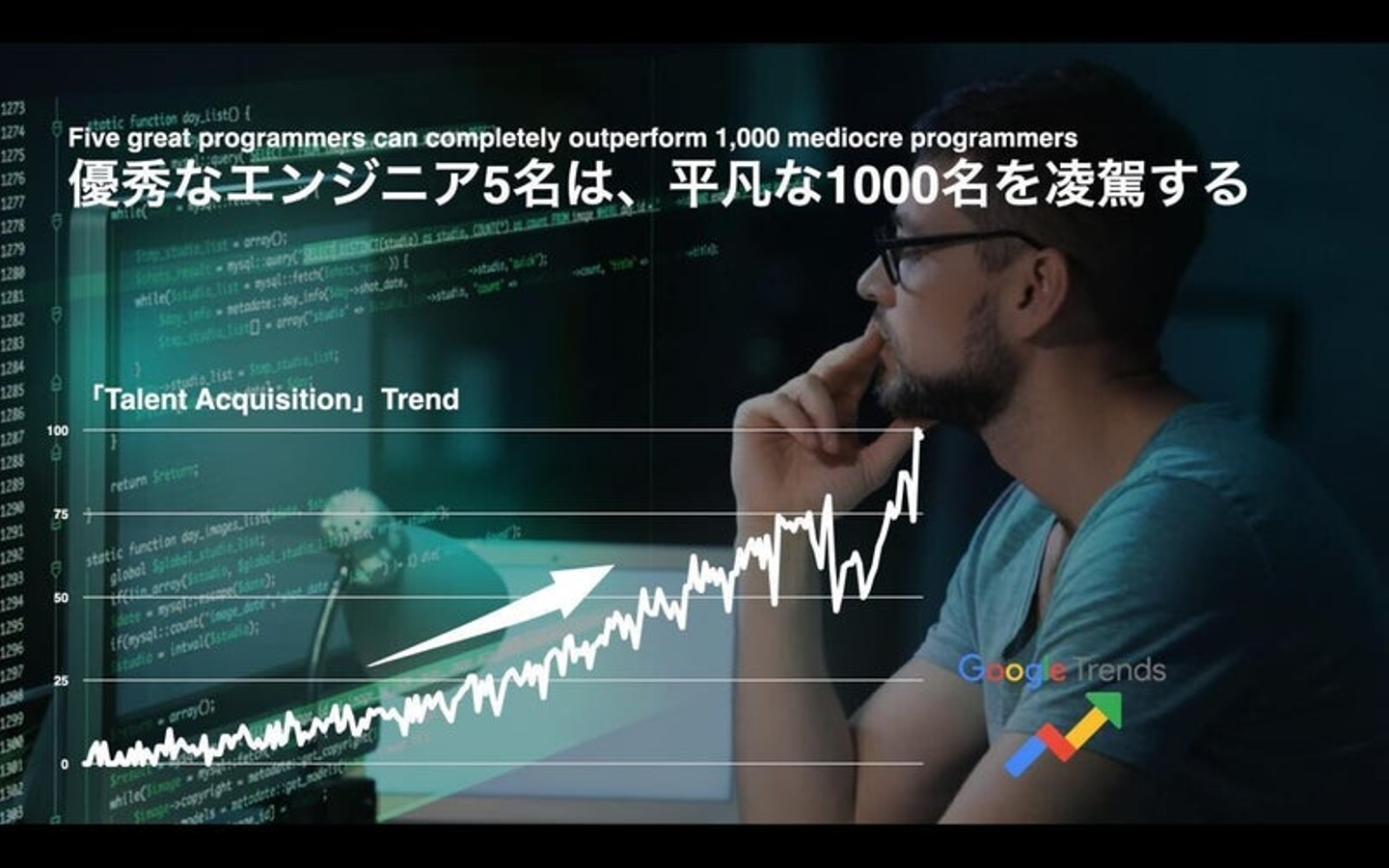 海外においては、優秀なエンジニア5名は普通の1000名を凌駕すると言われ、「タレントアクイジション」という概念は2013年頃からずっと来ています。Googleトレンドにおけるタレントアクイジションの検索のトレンド数はこれくらい伸びています。アメリカ合衆国で調べていますが、全ての国で変えてもらっても全く同じトレンドになります。それに対して、日本においては一切検索されてないという状況です。