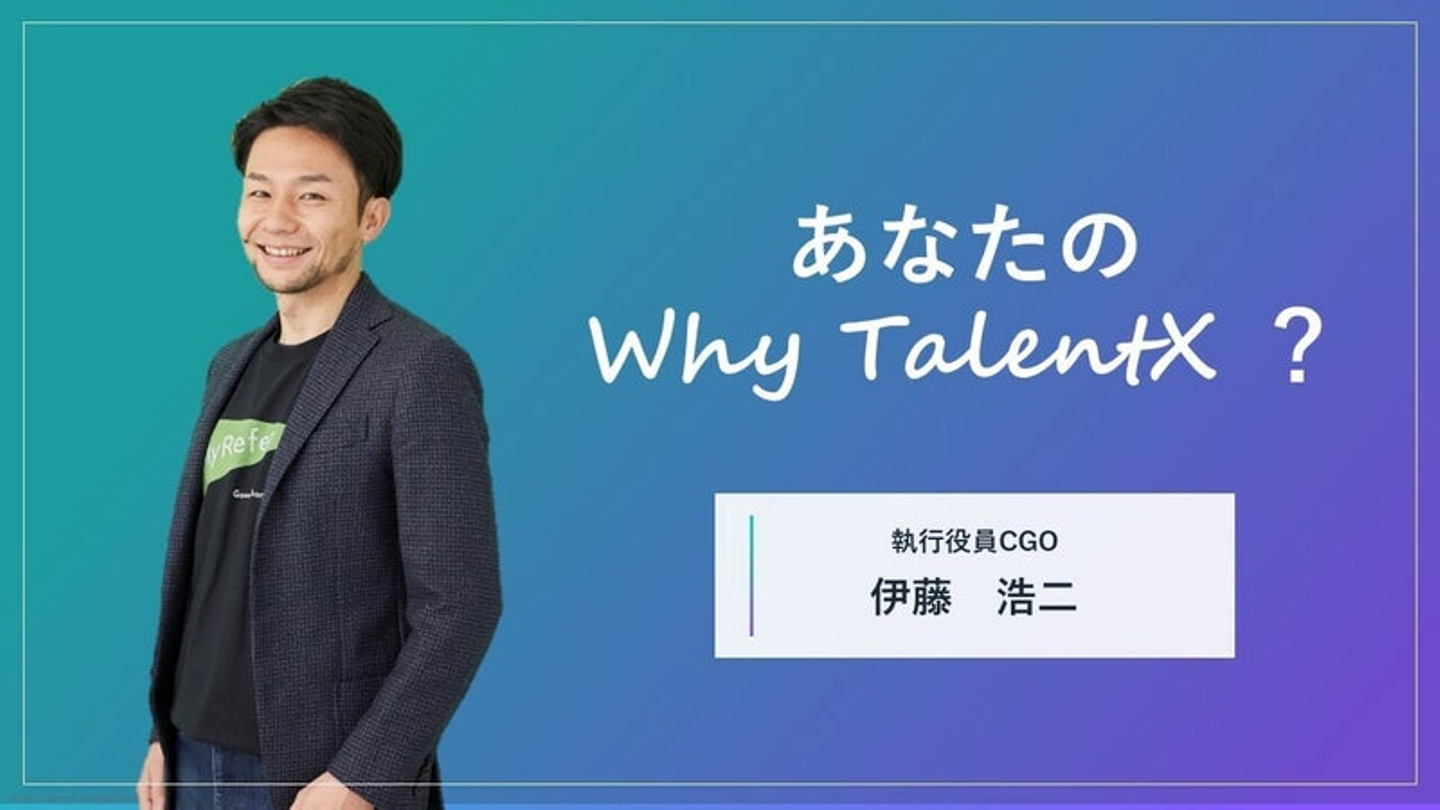 私の Why TalentX は社長である鈴木貴史。既存の概念を壊しながらも世の中へのインパクトの大きい価値提供をする熱い想いを支えるためにTalentXにジョインしている。そういう性分だからとしか言いようが無いが、昔から自分でゼロから何か作るとか、アツい想いをもって何かを自ら実現するようなことは無かったが、夢やアツい想いを持った人のそばにいて手助けをすることが多かったし、それが自分に合っていると思っていた。「MyRefer(現TalentX)の事業をMBOしたいと思っている、できなければ辞めて自分で作る」と聞いたときは、こんな経験生きてて2度はできないだろうなと思ったし、MBOするにせよ辞めるにせよ結果に関係なく一緒にやろうと思った。別にロジックもなければ感覚でしかない。そっちの方が面白いし、刺激があるし、やりたいと思ったから。