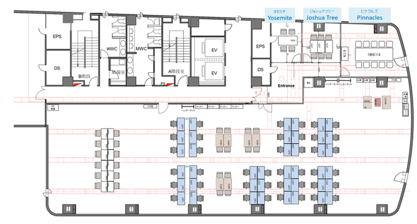 執務スペースと会議室あわせて約35坪から145坪へ移転したのでかなり広い!キツキツで最大84名のデスクを置ける想定です。