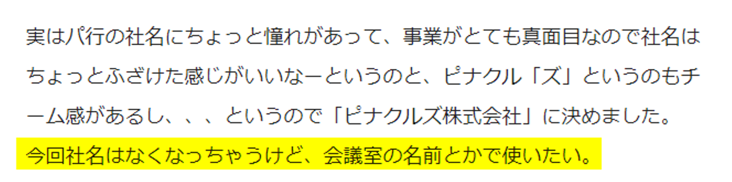 「会議室1」とかは寂しいので、弊社代表の貴山さんにまるっと命名権をパスしました。