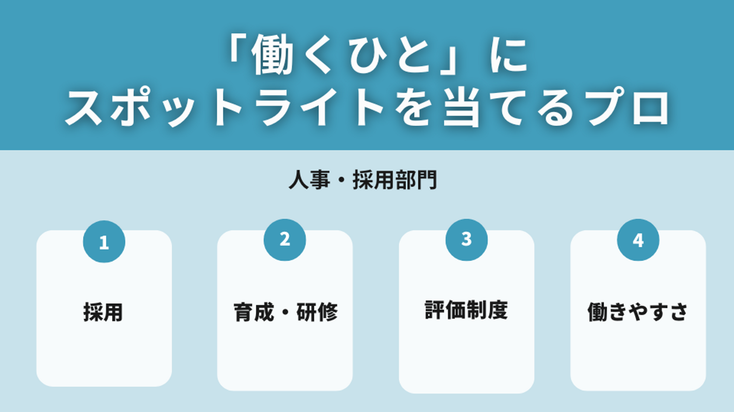 人事部門では、弊社で働くメンバーの採用、育成・研修、労務管理を行います。