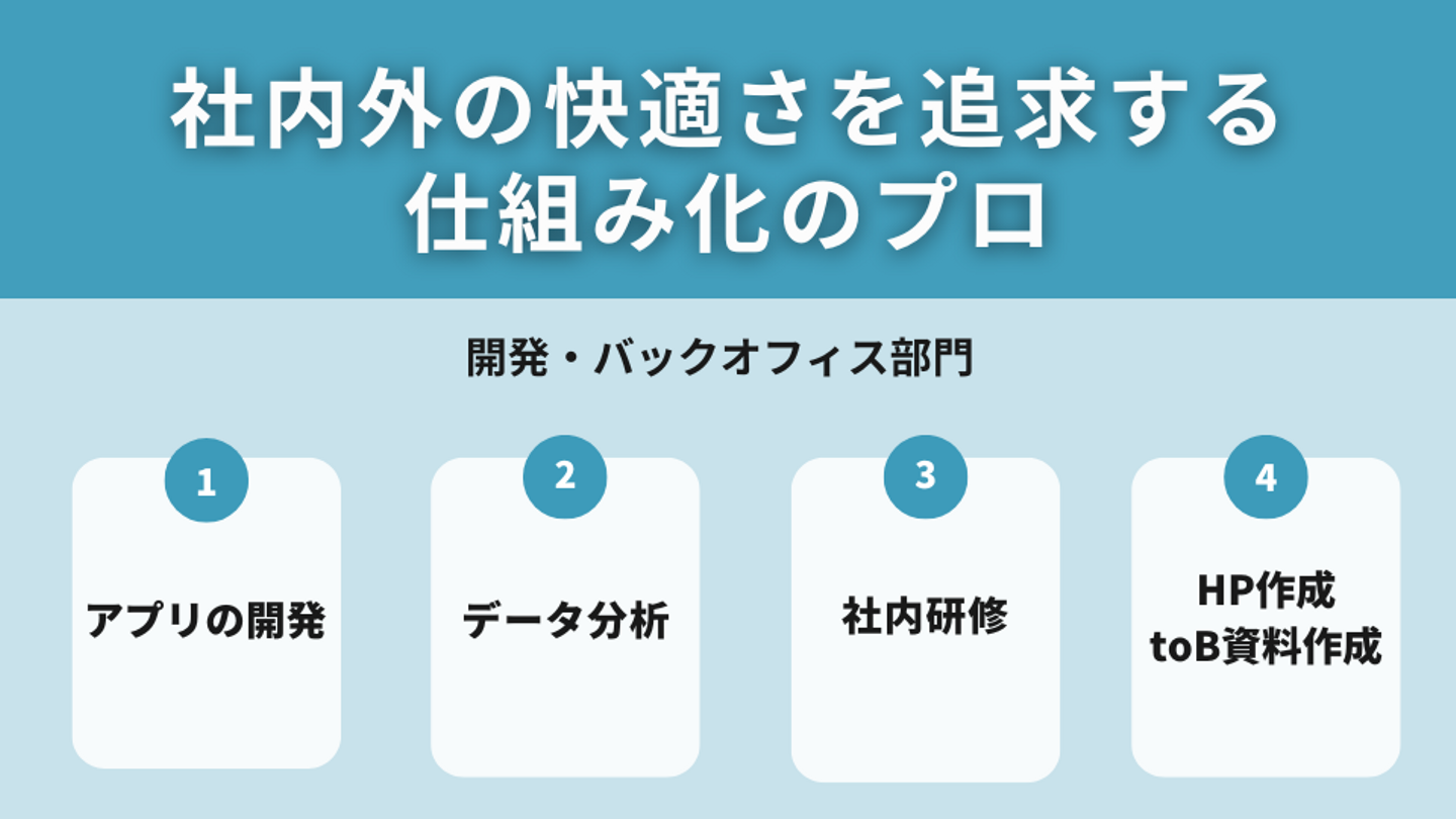開発・バックオフィス部門では、社内外における業務効率化をはかります。
