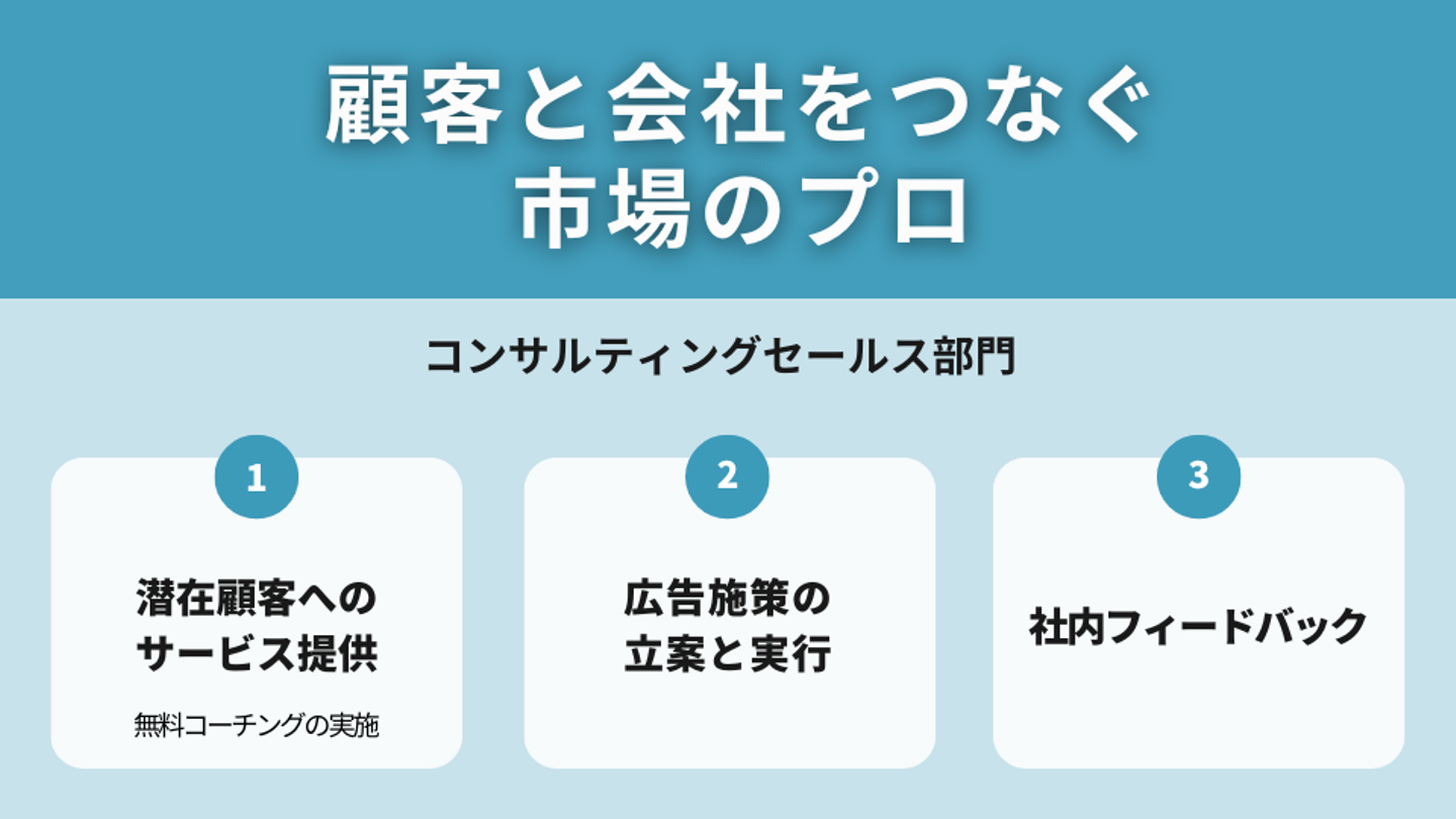 お問い合わせいただいた方に向けたコンサルティングセールスとなりますが、流入から決定までフェーズごとに数値で分析しながら、次の戦略を考え実行するため、深い思考力と高い提案力が身につきます。