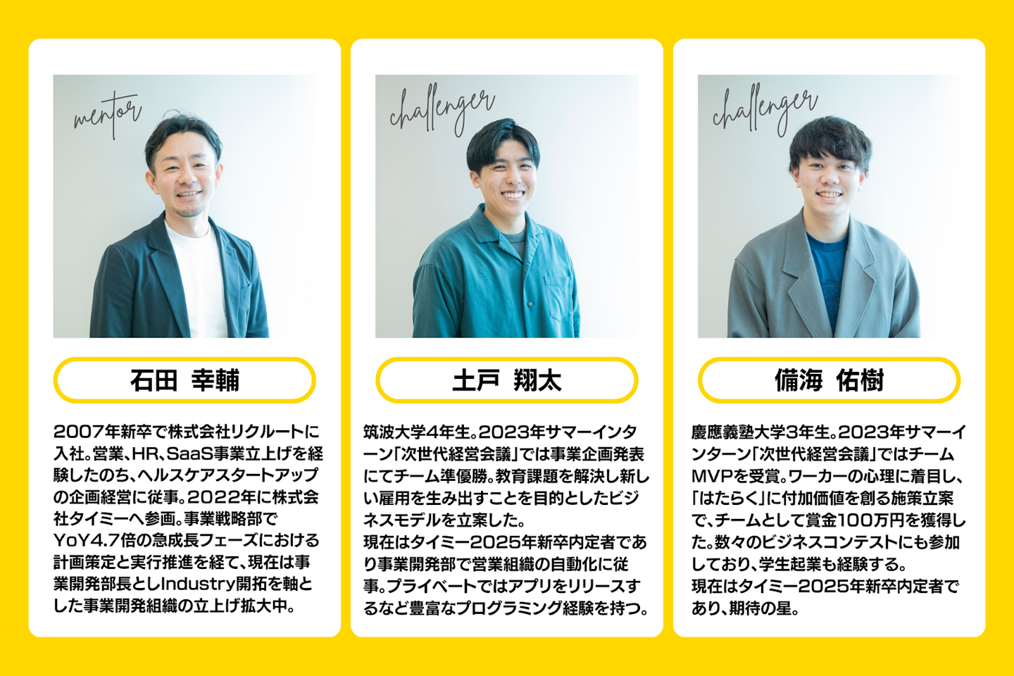 石田:2022年にタイミーへ入社し、現在は事業開発部の部長をつとめています。2007年新卒ですが、自分も就活時にはたくさんのインターンシップに参加してモチベーションを高めた経験があり、今回メンターとして参加できることをものすごく楽しみにしていました。