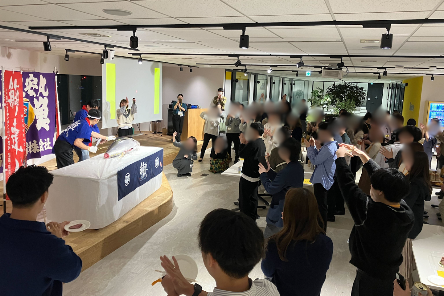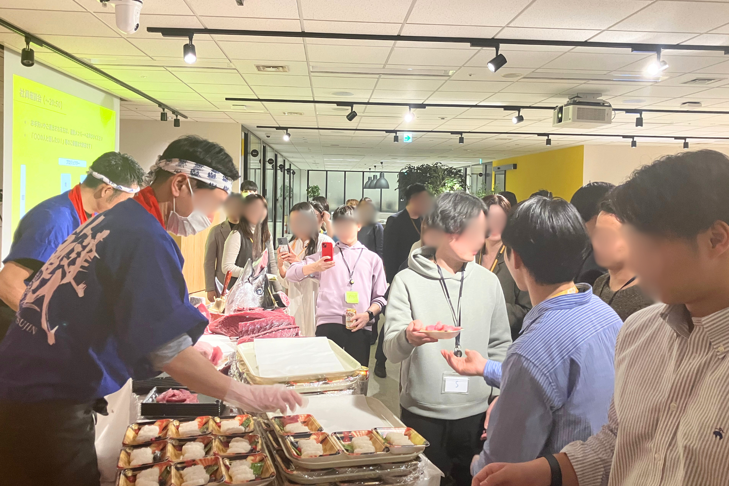 大きなマグロをお寿司にして配り、社員との座談会がスタート!
