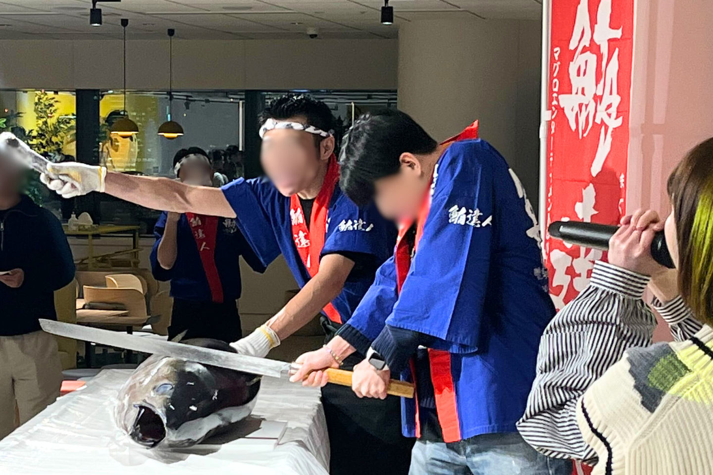 大阪の企業様にマグロとともに出張いただき、オフィスの広場で豪快に解体ショーを行いました!!