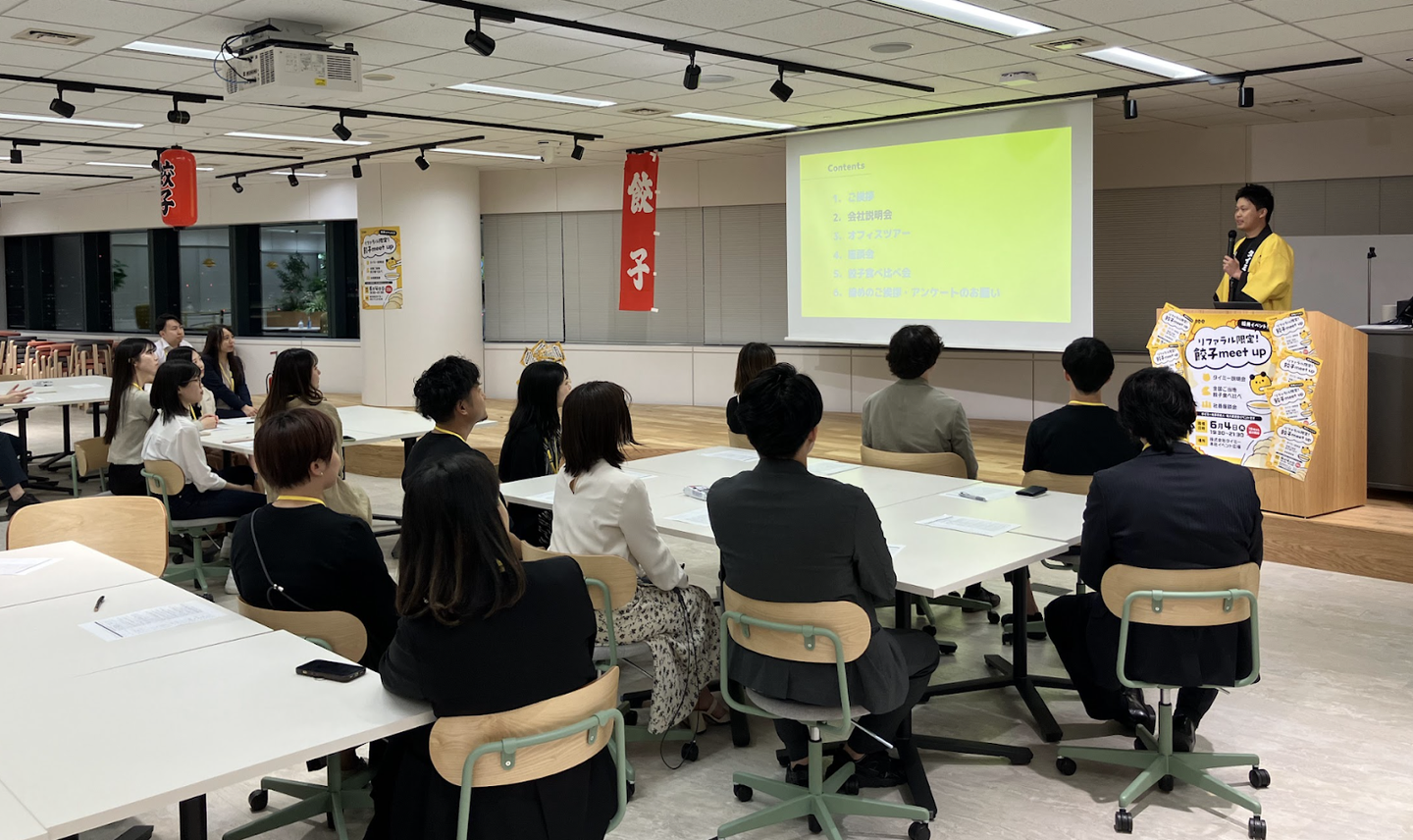 今回の採用イベントでは、全国から取り寄せたご当地餃子1,600個をオフィスのキッチンで直前に焼いて、アツアツの状態で参加者の皆さんに提供。