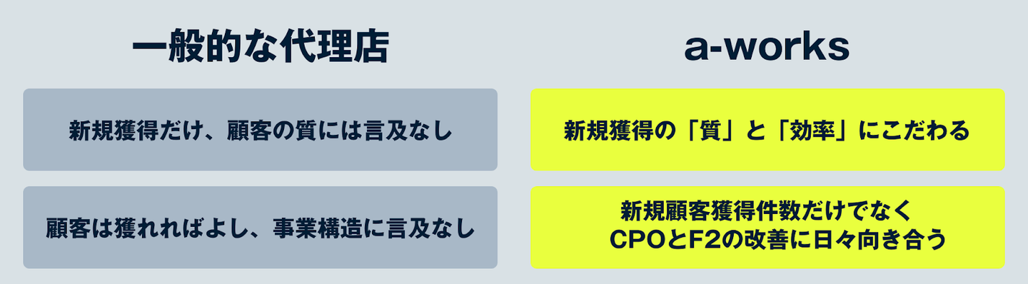 新規顧客獲得のための方法論って、わりともう確立されていて。少し学べば「これをやれば新規顧客獲得数を上げられますよ」と提案できる知識は身につく時代です。そして、F2獲得についても「それっぽく説明できる人」はたくさんいる。でも、a-worksのように「事業成長のために初回からいい顧客を獲得しましょう」と本気で取り組んでいる会社は多くないと自負しています。
