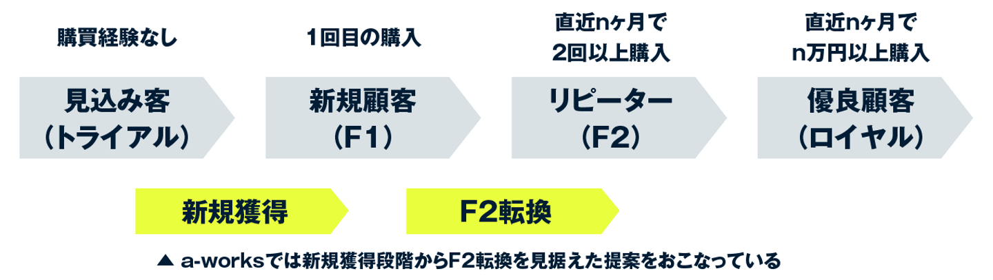 F2とは、2回目の購入率のこと。新規顧客獲得数を上げたうえで、クライアントの事業成長につなげるためには、継続して購入してくれるファンをつくらなければなりません。そのためには、新規購入を狙う時点から、F2転換を見据えて計画を立てる必要があります。