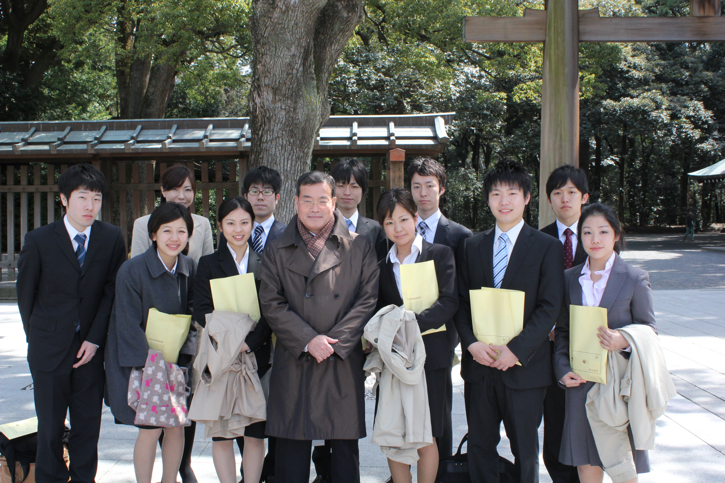 (入社式の後、明治神宮に参拝に行った時の様子。前列左から2人目が村山さんです。)