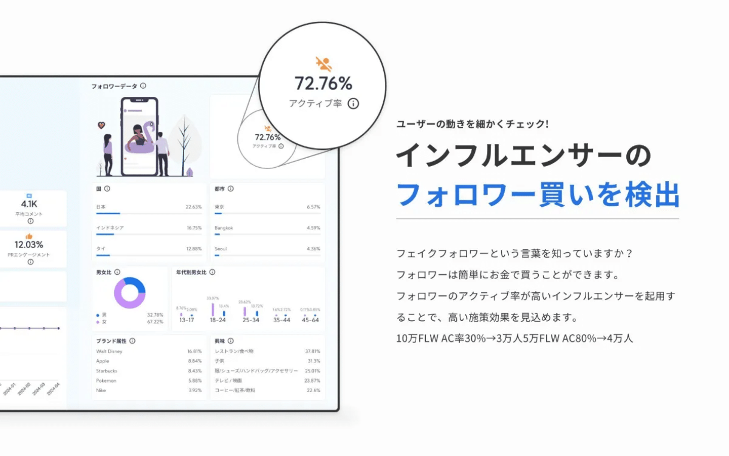 ※アクティブ率...インフルエンサーのフォロワーの中で、1カ月以内に「ログイン行動」(いいね、投稿、プロフィールの変更など)があったユーザーの割合を示す