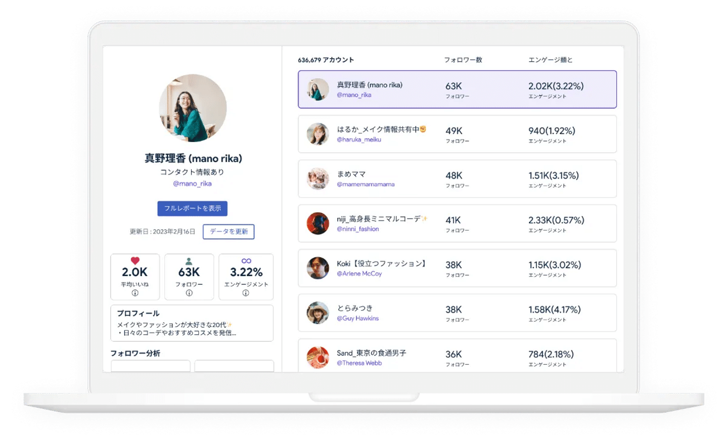 Aが開発・提供しているAstream(エーストリーム) では、フォロワーデータやエンゲージメント率をもとに効果的なインフルエンサー選定が可能です。