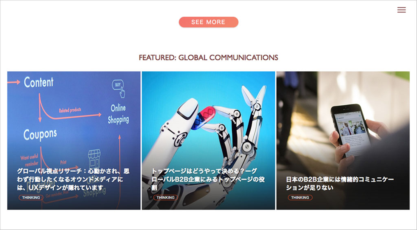 TOPページの記事一覧で過去記事が埋もれてしまうため、FEATUREDエリアを新設し、任意の記事コンテンツをPUSHできるように改善。特に今回は、弊社クリエイティブディレクターのJamesが執筆したグローバルコミュニーケーションに関連した記事を特集しました。
