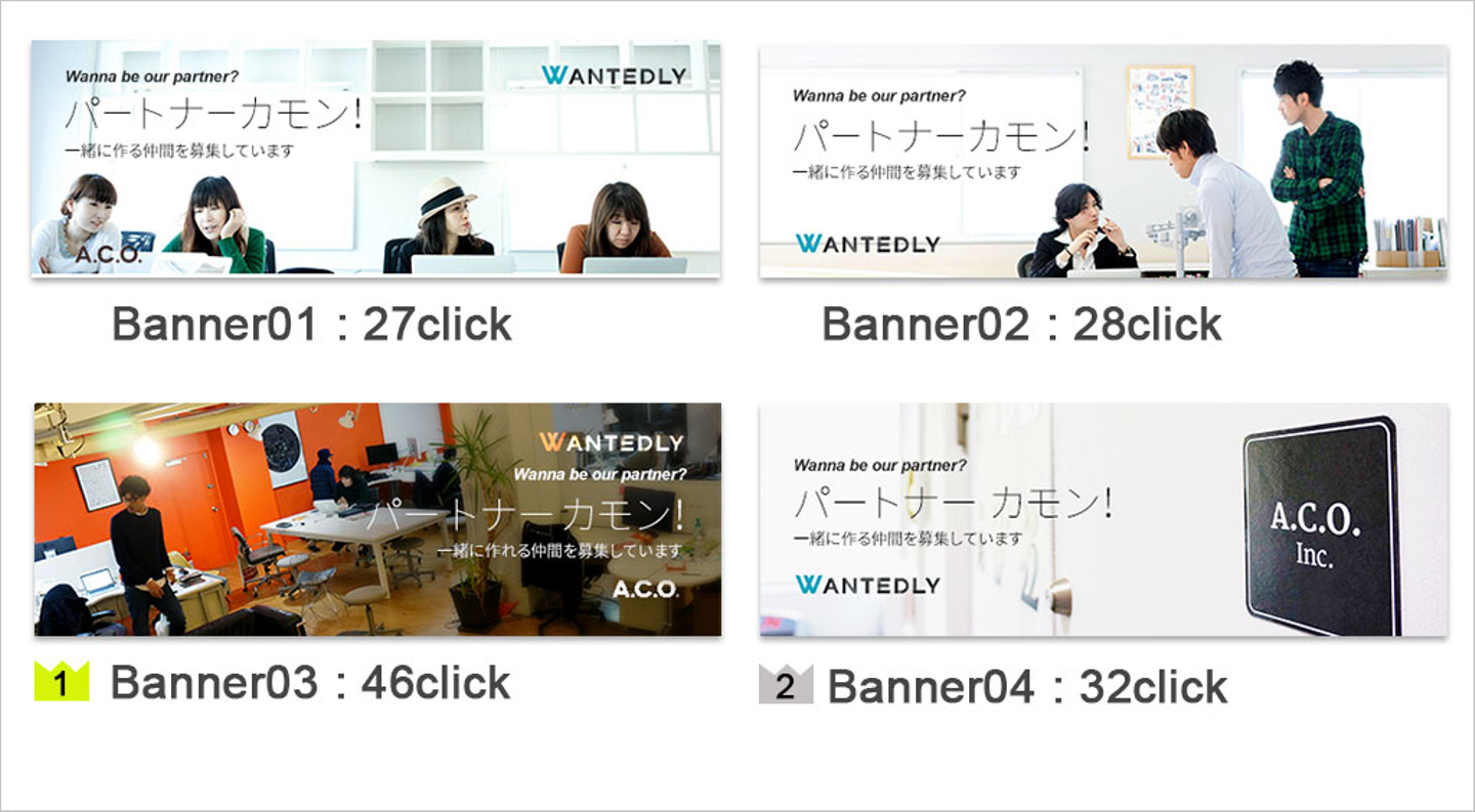 Banner03が押された理由として、他クリエイティブと比べて、①画面掲載時にコントラストが効いていて目立つ、②作り込みではない自然な写真、③スタッフとオフィスがバランスよく入っており、社内の雰囲気がわかりやすい、という点であったと今回は判断しました。