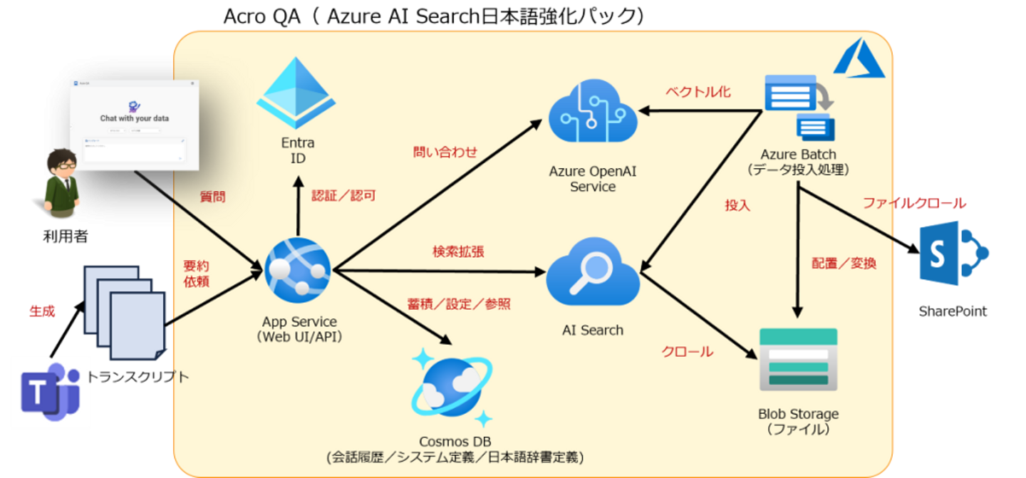 AcroChatAIでは、Azure OpenAI ServiceとAzure AI Searchを組み合わせて活用しており、社内ナレッジを活用したAIアシスタントの開発を実現しました。