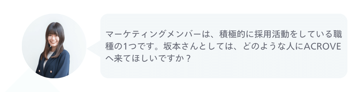 自分軸だけでなく、自分が何に対して価値提供できそうか?自分がACROVEでどんなバリューを発揮できるか?を仮説でいいので言語化いただけると嬉しいです。