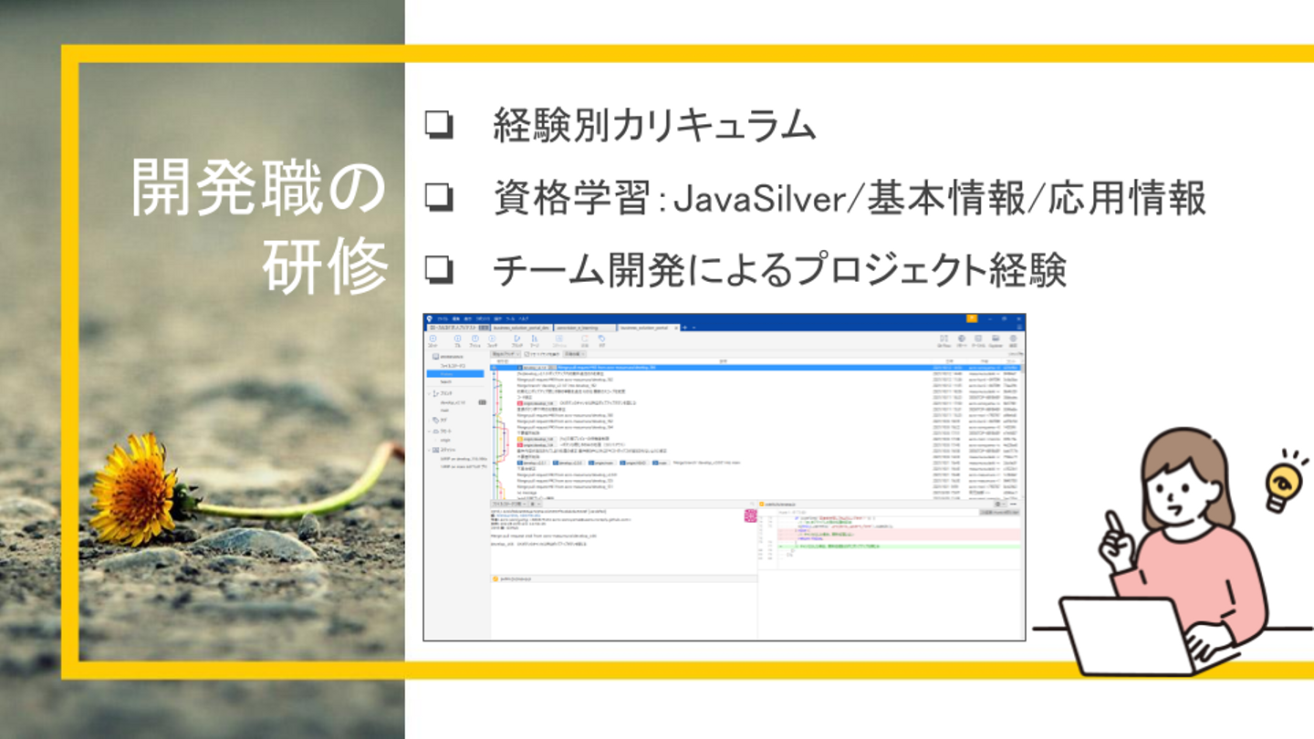 開発のスキルアップとして成果物の作成をサポートしておりますが、経験者の場合は現場参画の決定も早いので、細かい研修というよりは個人の裁量に依存するところもございます。