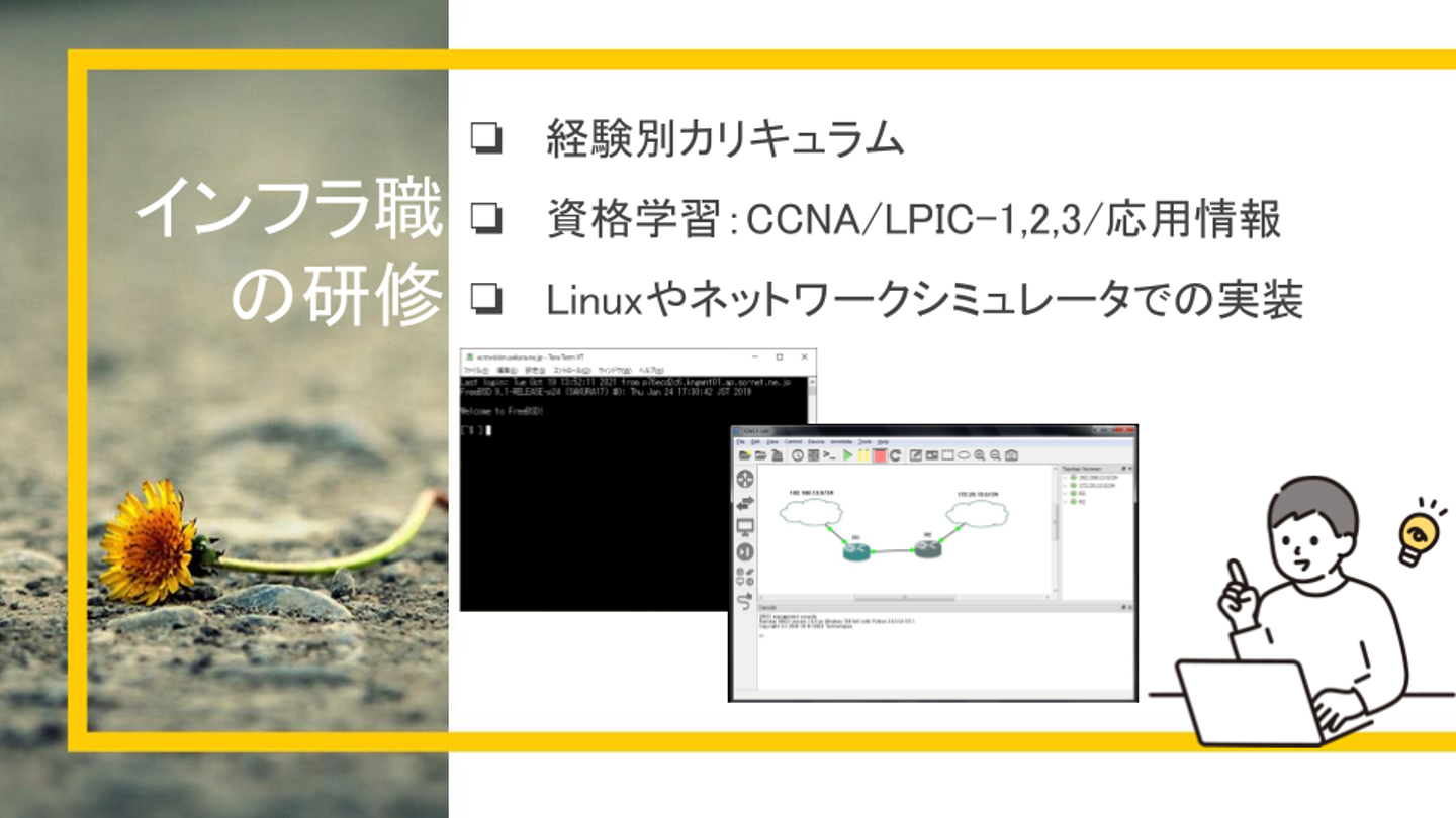 研修内容は基本情報技術者、応用情報技術者試験の資格取得とLPIC-2の資格取得のカリキュラムとなっております。