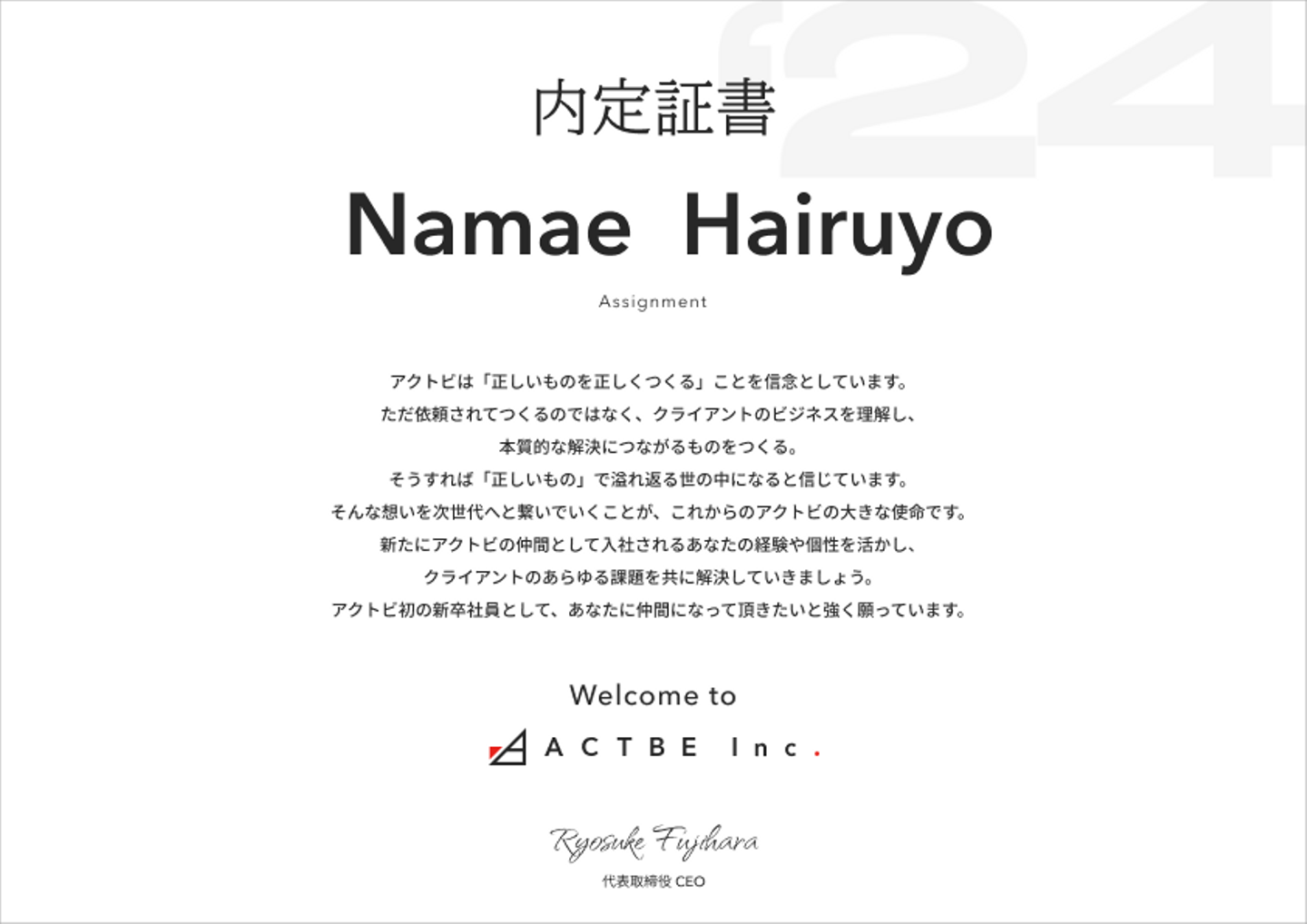 内定式は、初めて社会へ出る一歩目にアクトビの仲間になることを決意していただいた内定者に対し、「感謝を伝える・全力で歓迎する」ために企画しました。