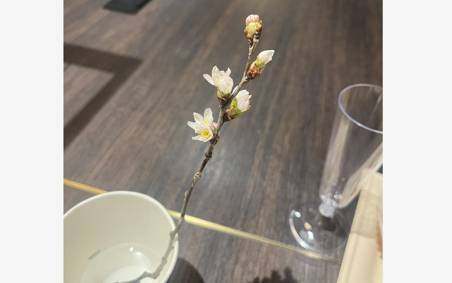 先日、我々東京支社の仲間たちが働いているシェアオフィス「just co」の受付担当ケビン(マイメン)から、まだ蕾の状態にも満たない桜の枝をもらったので、水につけて育てることに。