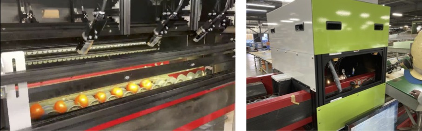 「いわき小名浜菜園」に実装されたAI選果機の様子(左:外観品質カメラ、右:内部品質センサー)