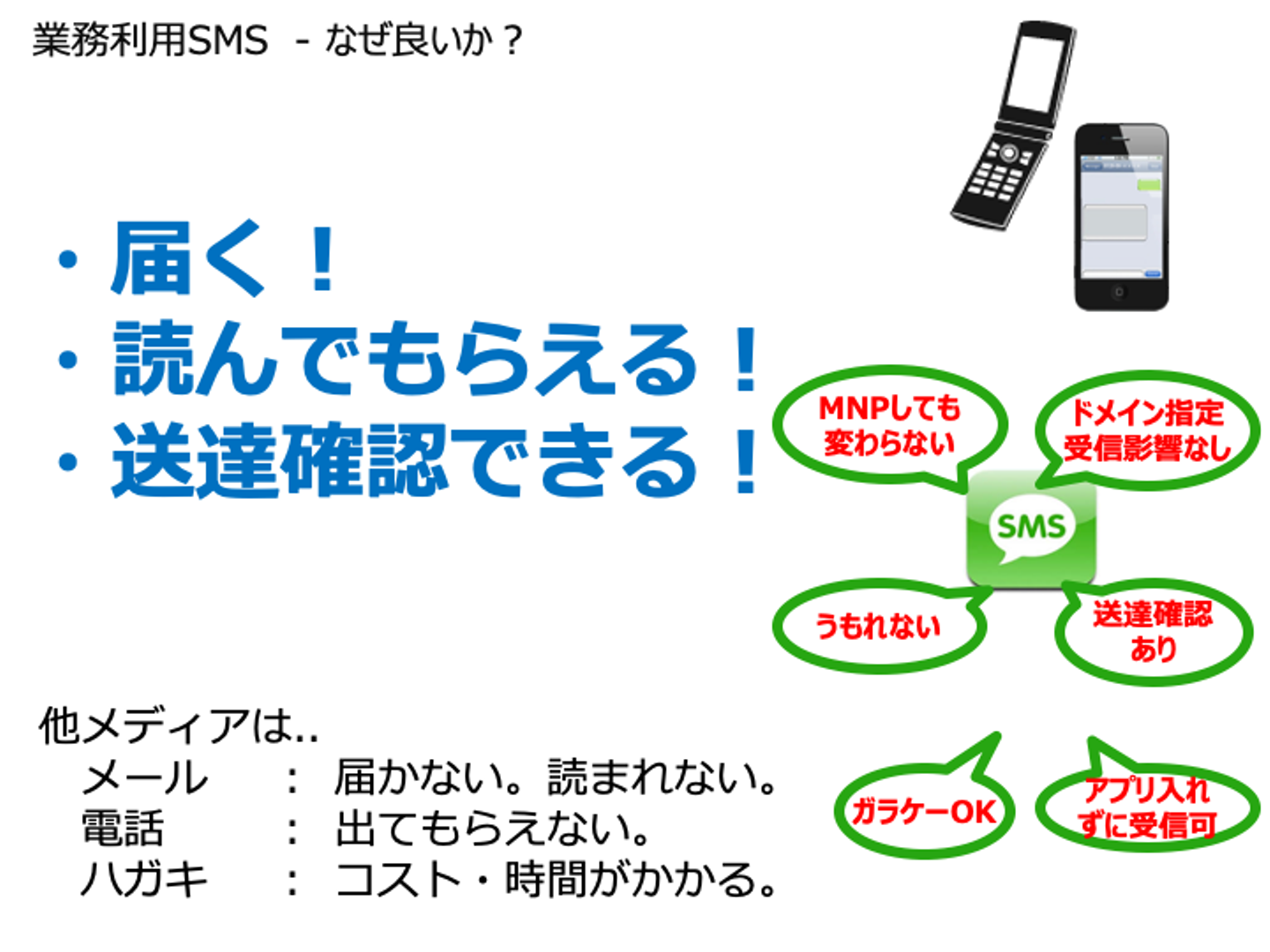 そんななかSMSは、読んでもらえる(開封率がとにかく高い)上に、メールと違って携帯端末に届いたかどうかの送達確認までできるので、ビジネスのお知らせ用途にはもってこいのシステム!というわけで、どんどん普及が進み、その用途も多岐にわたって広がり続けています!