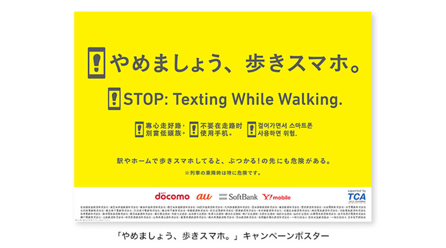 JR東日本の歩きスマホ禁止ポスターの英訳には“Stop: Texting while walking”という文章が採用されているくらいなんですよ。