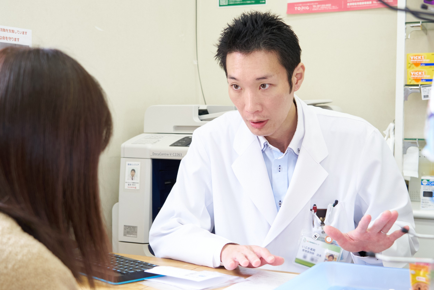 (Musubi を利用し真剣なまなざしで服薬指導をする いぶき薬局 の 管理薬剤師: 関 )