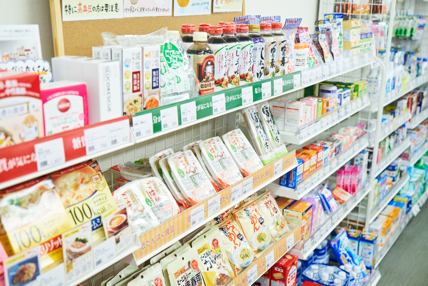 腎臓透析にかかる処方や腎臓疾患に特化した薬局となっていますので、低タンパク食品や減塩調味料など、ニーズに合わせた商品を取り揃えています。