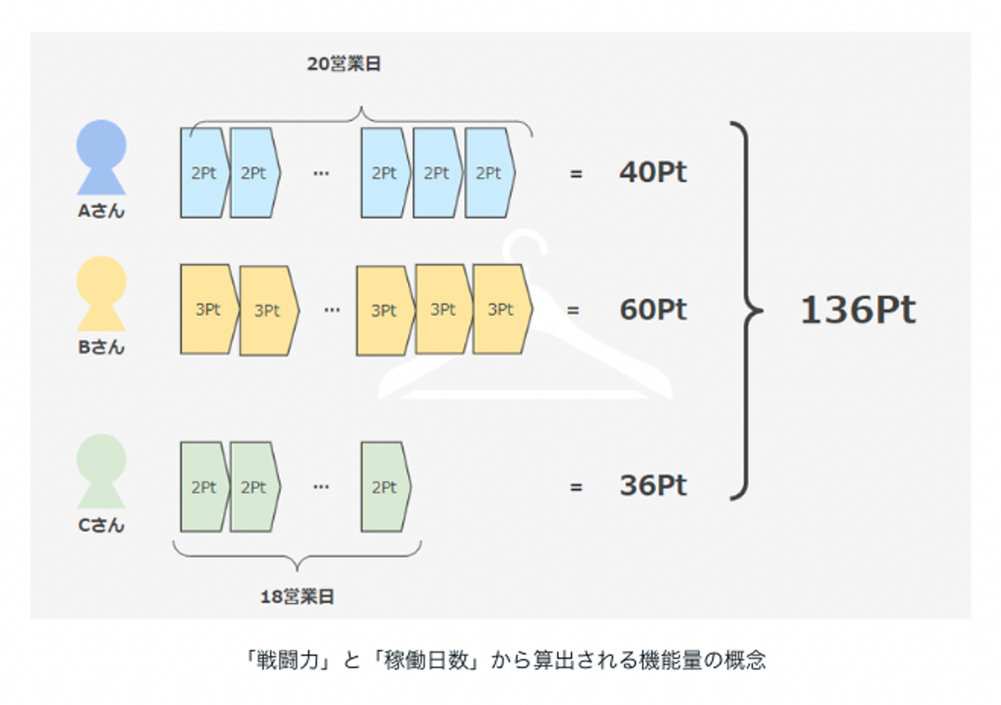エンジニアやデザイナーのレベル感に合わせて一日あたりに生み出せる機能量(戦闘力)を定義し、そこに稼働予定日を掛け合せると、月度当たりに生み出せる機能総量を出せます。
