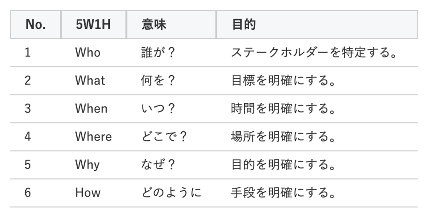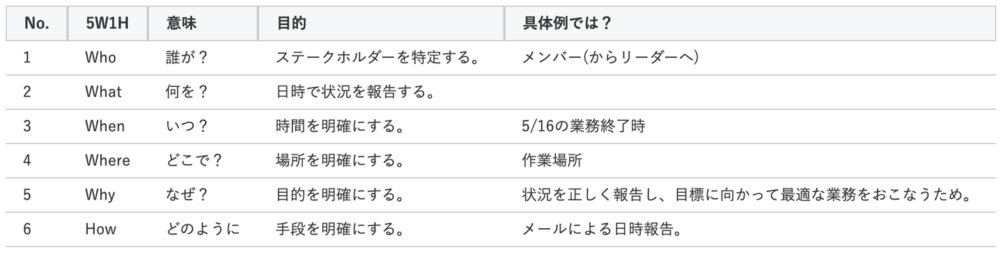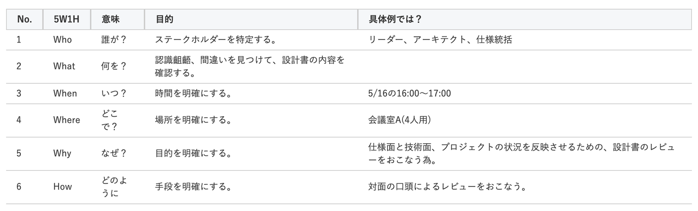 普段の業務を進めると、「5W1Hが重要だ!」という話を、報告や会議、設計のレビューなど、