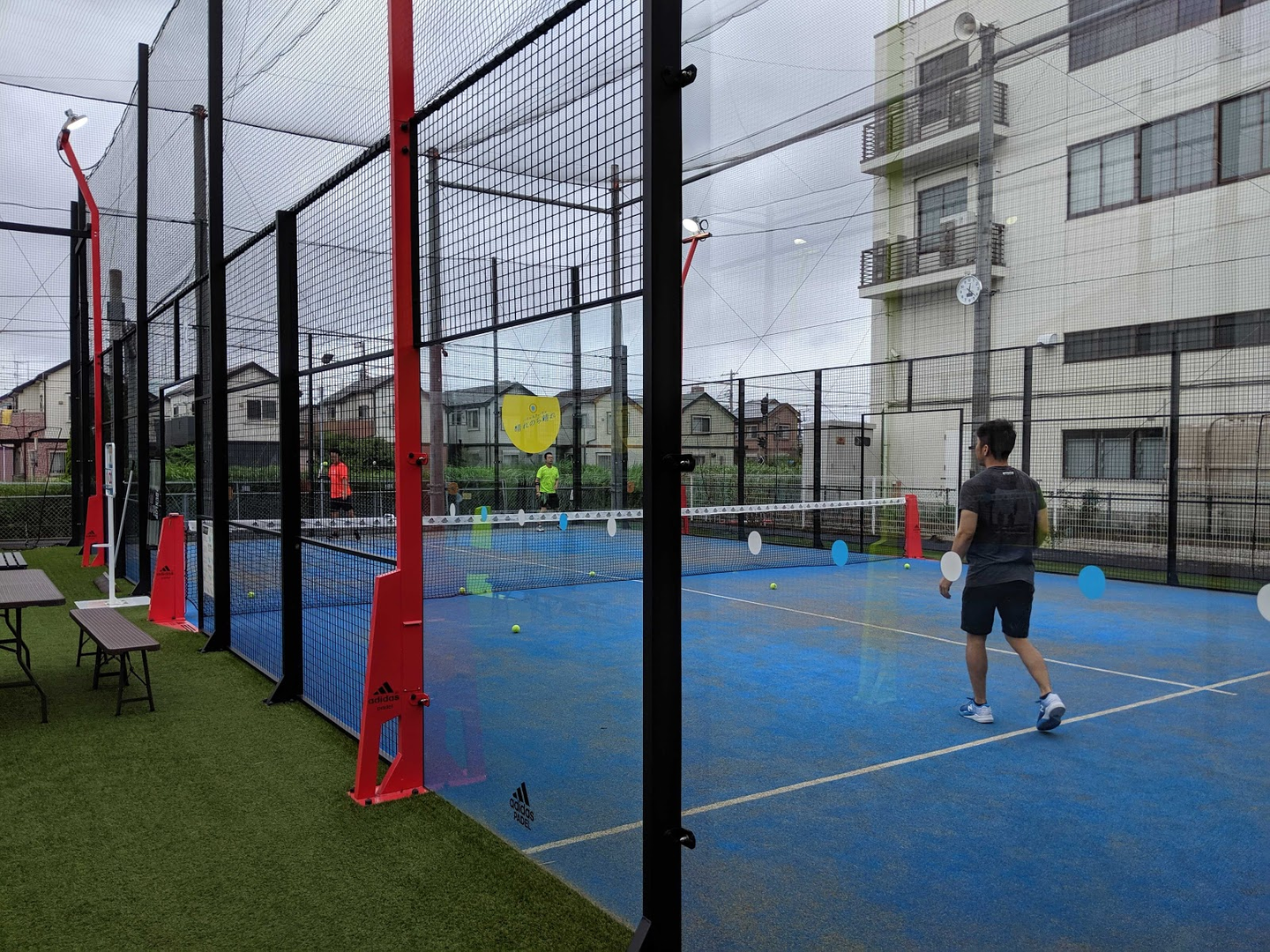 試合は周囲を強化ガラスでぐるりと囲まれたコートで行われます。向かい合う対戦相手とラリーし、点を取り合う競技です。