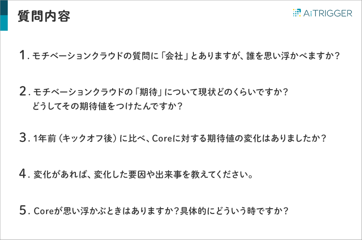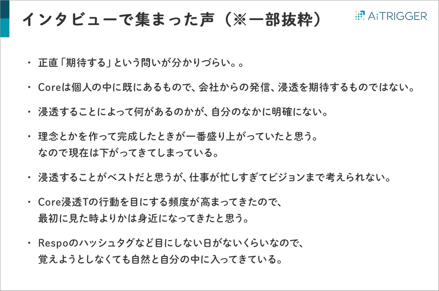モチベーションクラウドのスコアを一部、Core浸透プロジェクトのKPIにしていたのですが、全部署のインタビューを通して、このKPI設定は適していないと判断しました。来期はKPI指標を検討することになりました。