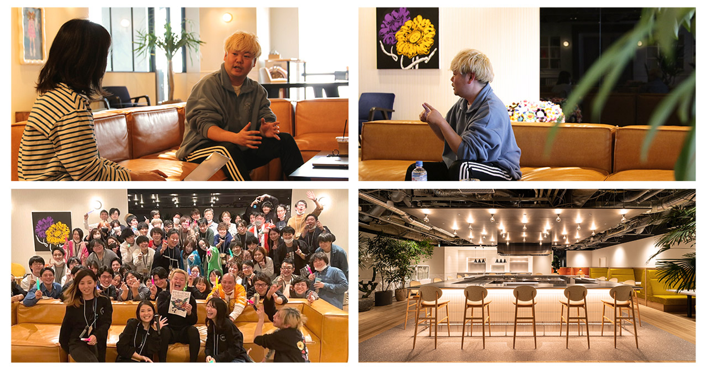 アカツキグループには全メンバーが自由に利用できるラウンジがあります。そこにはカフェ併設のキッチン、開放感のあるオープンスペースなど会社の象徴となるエリアとなっています。社員以外の方もご入室いただけるので、クライアントの方や面接でお越しの方も初めてご覧になった方からはお褒めの言葉をいただくこともあります。