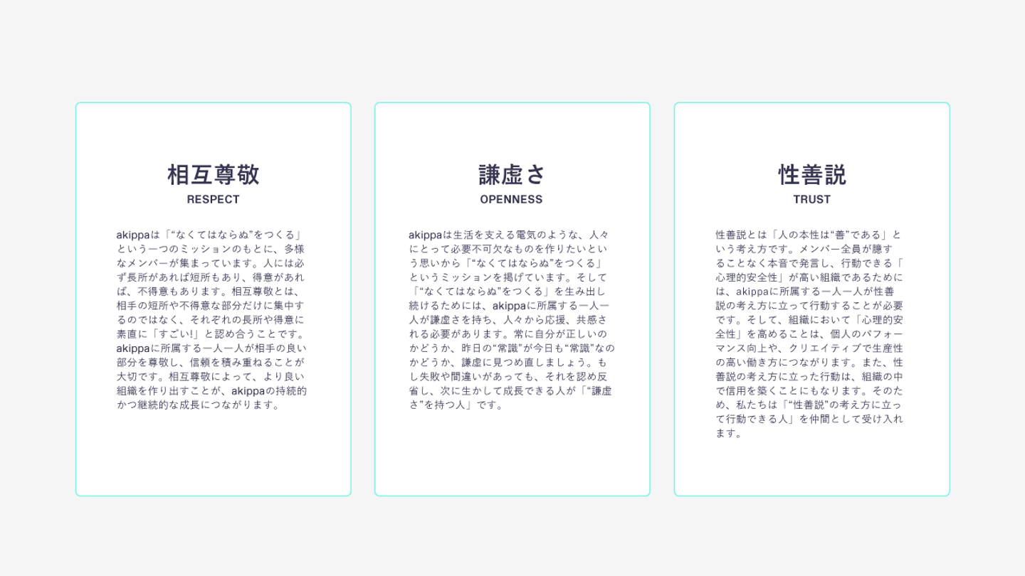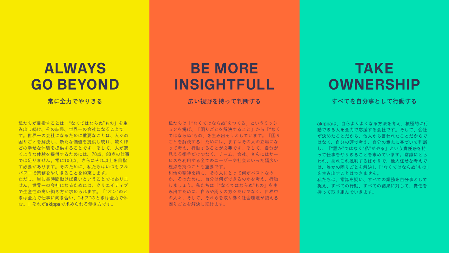 まず「バリュー」はakippaのミッションである「”なくてはならぬ”をつくる」を実現するための行動指針で、採用や人事評価、日々の業務、経営判断まで一つ一つの行動や判断の基準となるものになります。