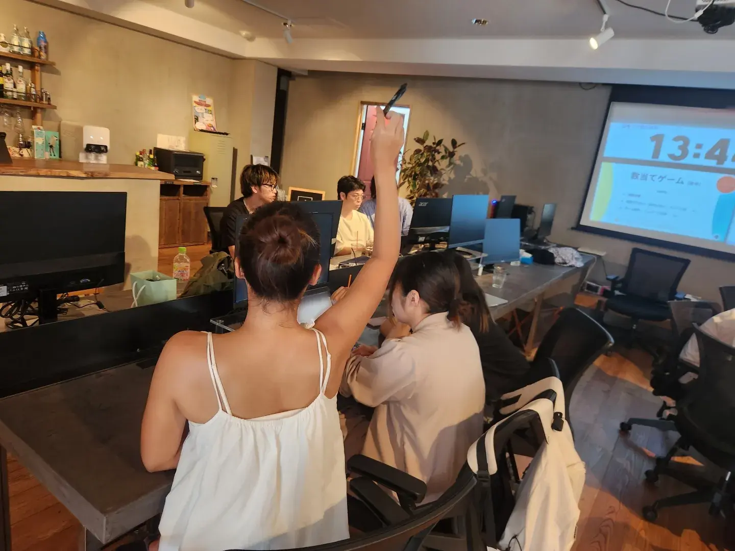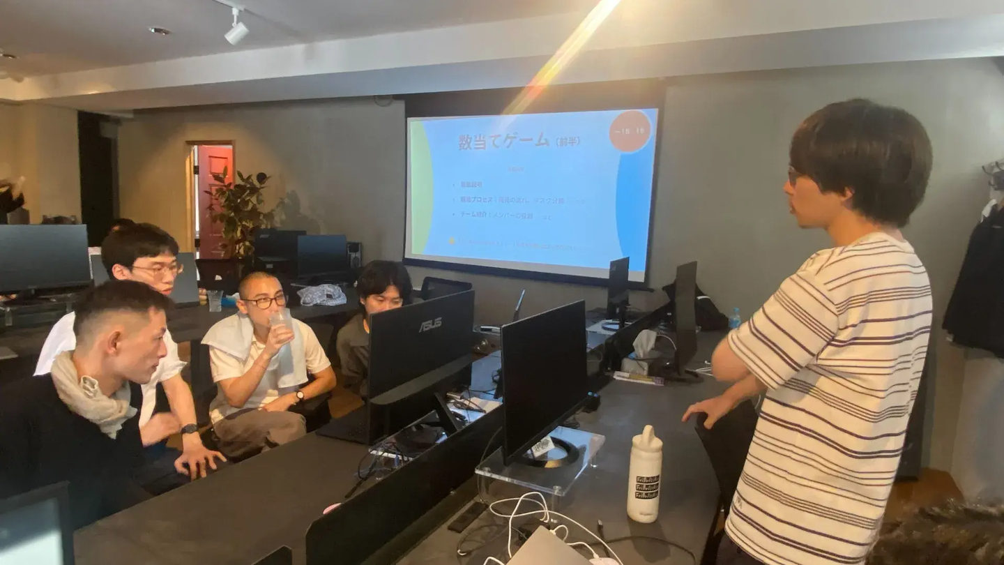 外は夏を浴びるような天気ですが、快適なオフィスでは新たな企画が始まります。JavaScriptを使って数当てゲームを作ろうというものです。現場経験のある先輩たちと協力しての開発ということで、私たち研修生にとっては、ちょうどいい実践の機会でした。