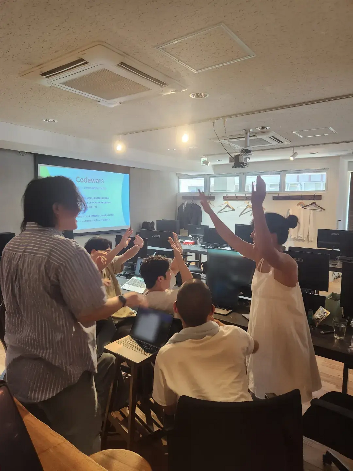 次は、Codewars の時間です。コードを記述して問題を解けたらクリアというゲームですが、これをもとにチームで分かれてポイントを競います。JavaScriptを使った問題ということで、研修で学んだ内容が役立つ展開に。