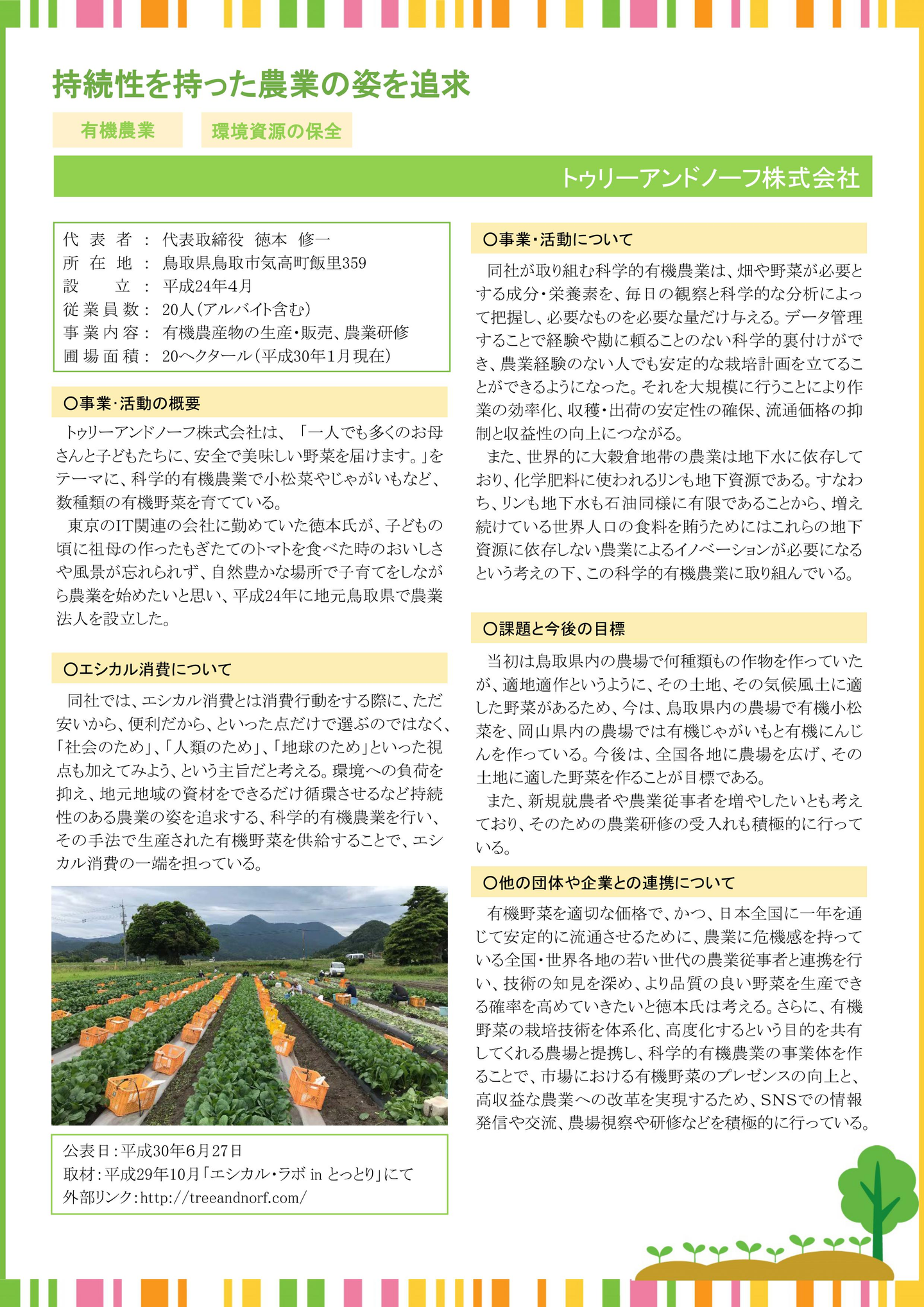 新卒やシステムエンジニアが研修でも毎年訪れる鳥取県で、当社農業事業を担うトゥリーアンドノーフ株式会社が倫理的消費(エシカル消費)に関する取組事業者として、消費者庁の消費者行政新未来創造オフィスプロジェクトとして採択されました。